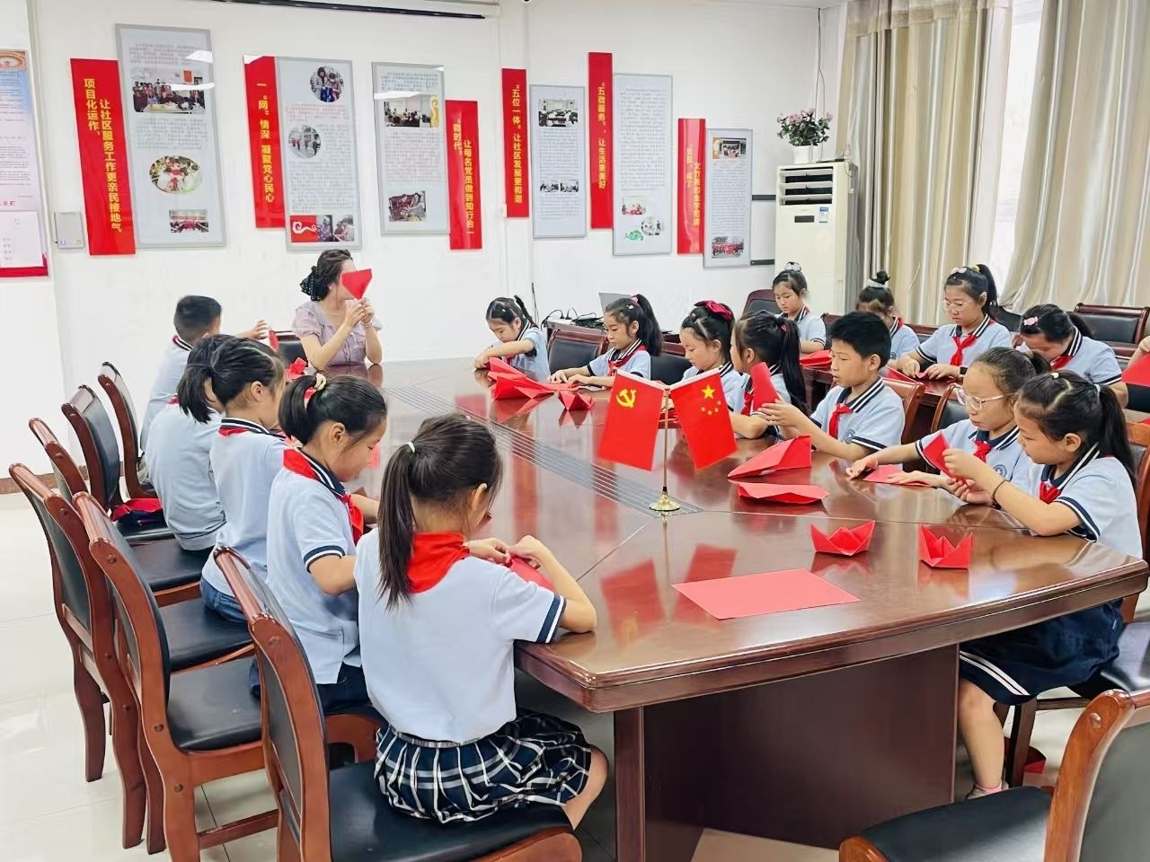 在文竹苑社區(qū)黨員會(huì)議室內(nèi),來自蚌埠第三實(shí)驗(yàn)學(xué)校的徐璐潔老師用覆著粉筆灰的手掌與孩子們稚嫩的小手共同折疊鮮紅卡紙。“這一道折痕是1921年南湖的星火?!毙炖蠋煂⒔鸱埸c(diǎn)綴在船頭,“下一道折痕是載人飛船探秘深空的2035!”孩子們將寫有夢想的紙條藏進(jìn)船艙——“我要造智能紅船守護(hù)祖國海疆!”“我想在月球上種我喜歡吃的小西瓜!”三十艘“初心紅船”在黨員會(huì)議室匯成星河,船頭黨徽在燈光下如炬火閃耀。
