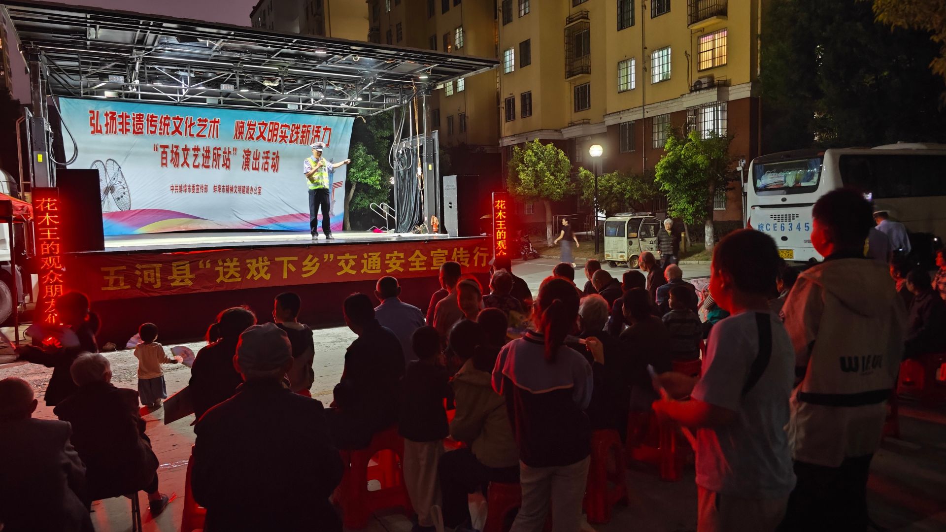 9月23日晚,蚌埠市五河縣頭鋪鎮(zhèn)花木王村新時(shí)代文明實(shí)踐廣場(chǎng)上燈光璀璨、氣氛熱烈。由蚌埠市委宣傳部、市文明辦主辦的“百場(chǎng)文藝進(jìn)所站”活動(dòng)在此舉行,不僅為村民帶來一場(chǎng)非遺文化大餐,更通過“舞臺(tái)演出+專題宣講”的方式,將交通安全與移風(fēng)易俗宣傳自然融入演出全程,實(shí)現(xiàn)文化娛樂與文明教育的雙效融合。