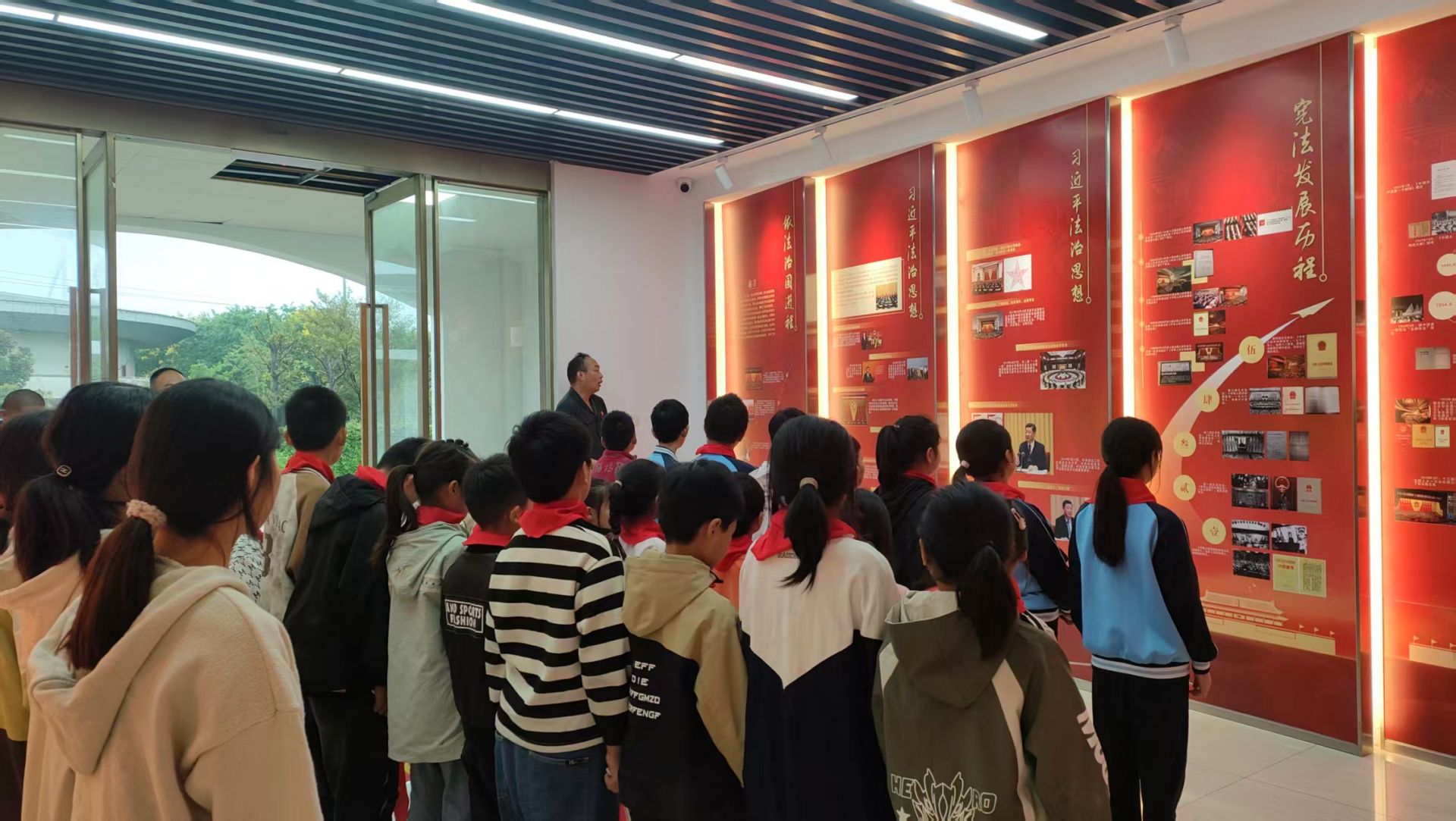 活動(dòng)首站為法治展廳,講解員圍繞“依法治國進(jìn)程”“習(xí)近平法治思想”及“憲法發(fā)展歷程”等內(nèi)容展開講解。一張張歷史圖片、一個(gè)個(gè)法治故事,讓課本中抽象的法律變得鮮活,同學(xué)們專注聆聽、不時(shí)提問,眼中滿是對(duì)法治文明的敬畏。