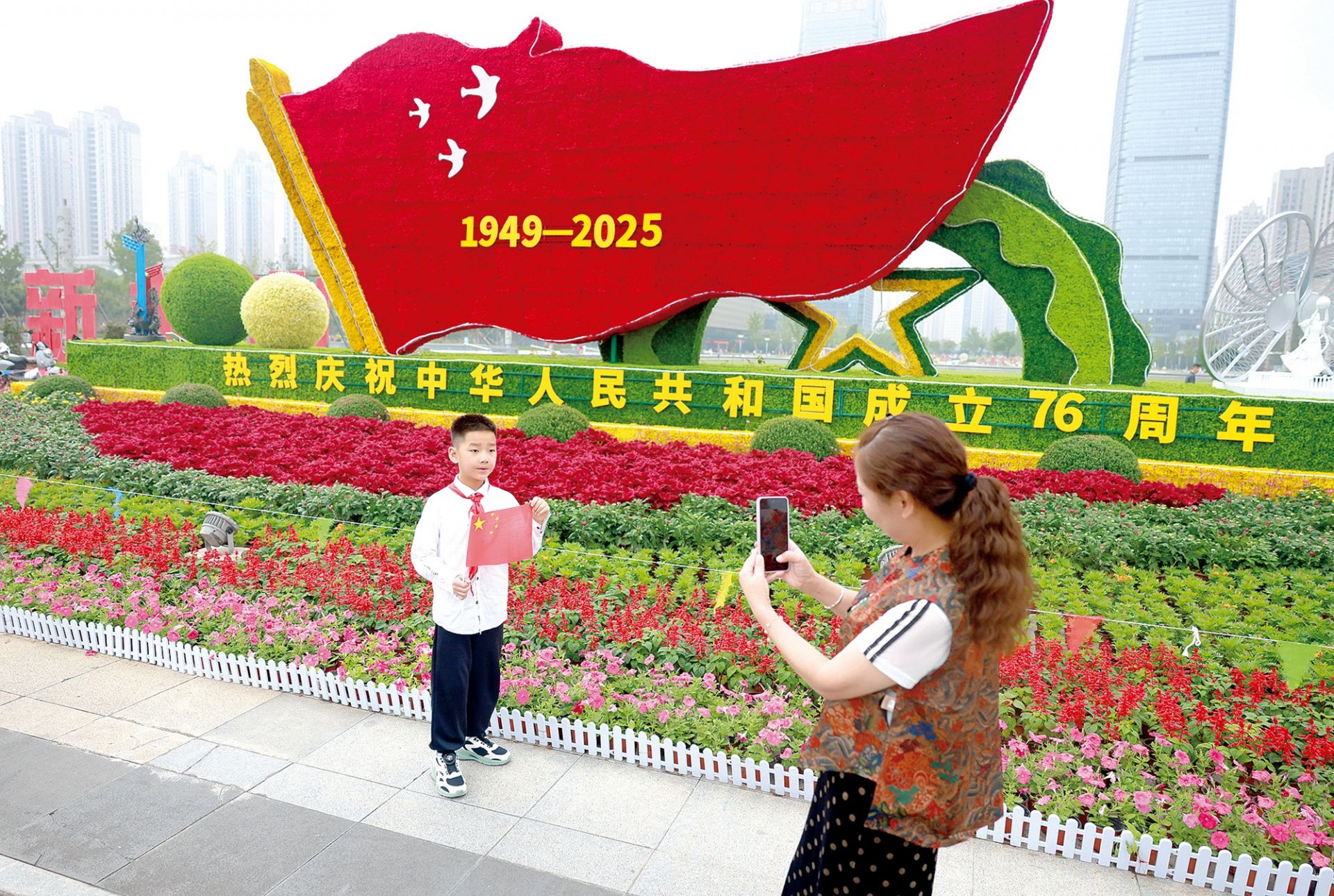 10月1日,市民廣場(chǎng),市民在國(guó)慶主題花卉造型前合影。