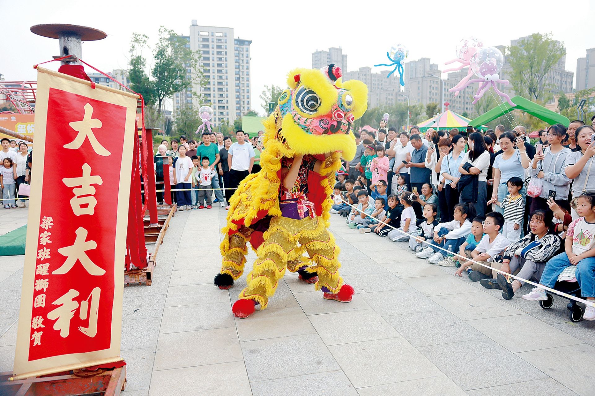 10月4日,游客在小黃山公園觀看舞獅表演。