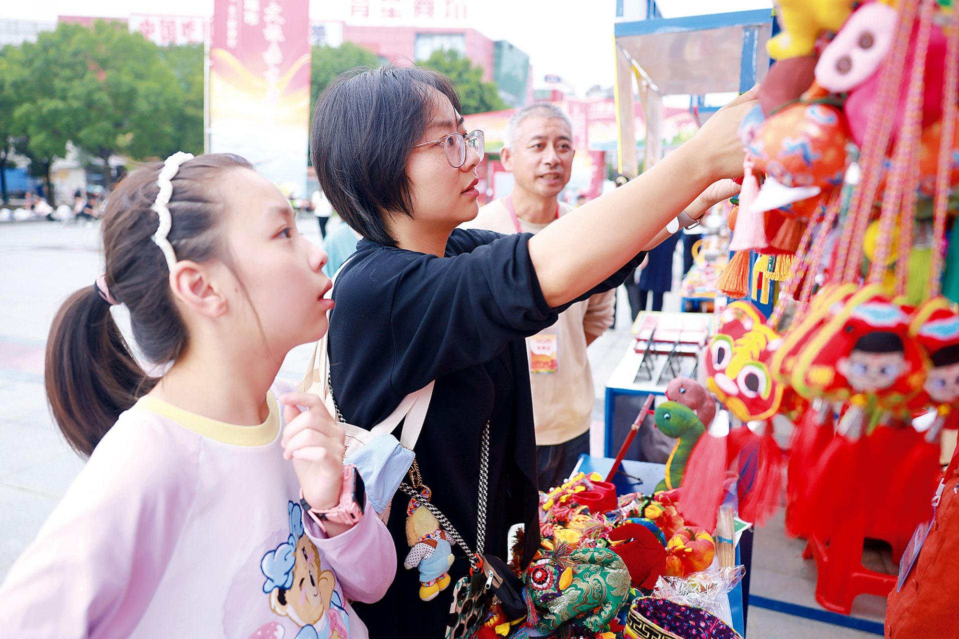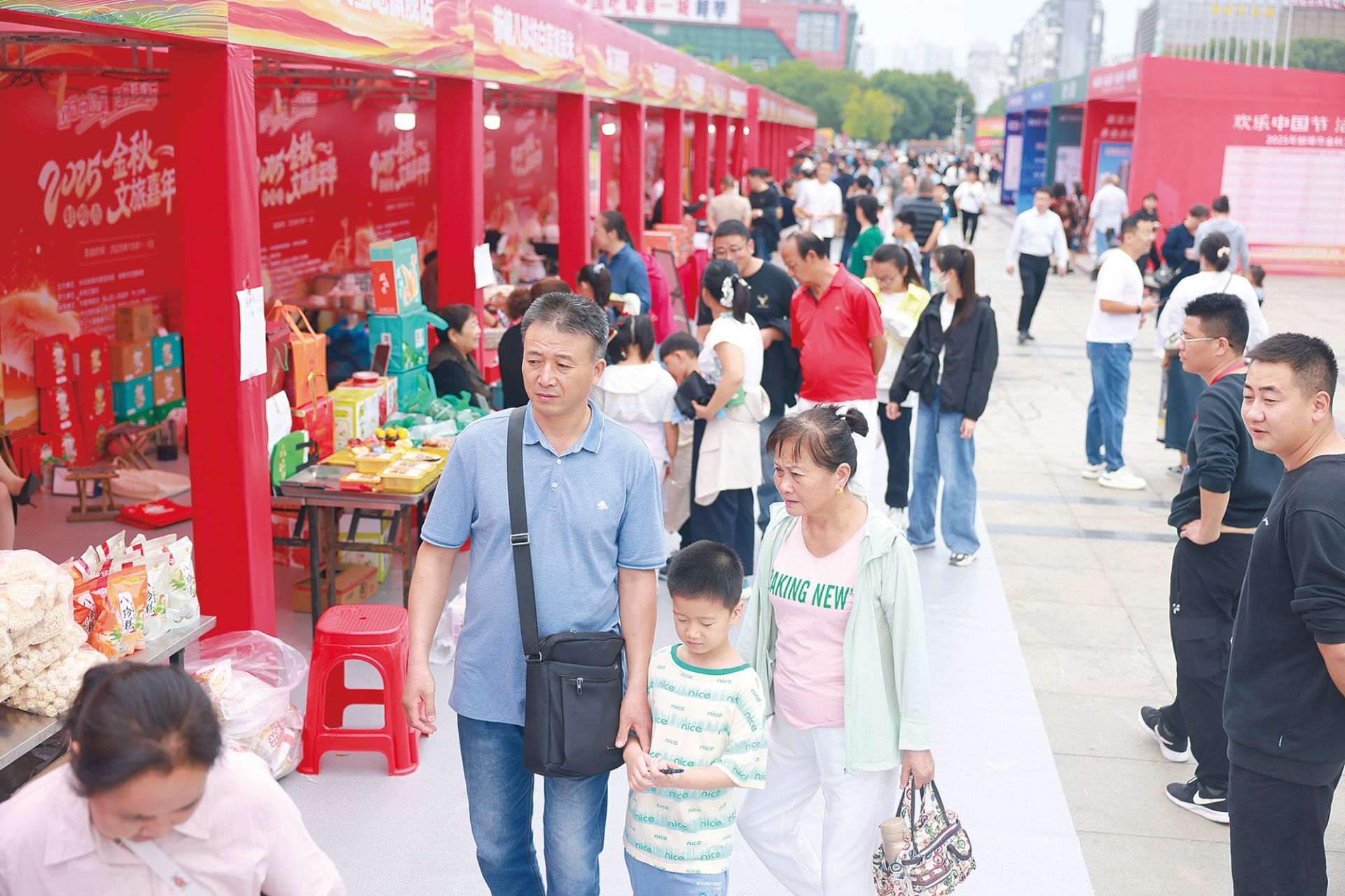 10月1日,淮河文化廣場(chǎng)西廣場(chǎng),“歡樂中國(guó)節(jié) 活力蚌埠行”2025年蚌埠市金秋文旅嘉年華活動(dòng)現(xiàn)場(chǎng),市民選購(gòu)中意商品。