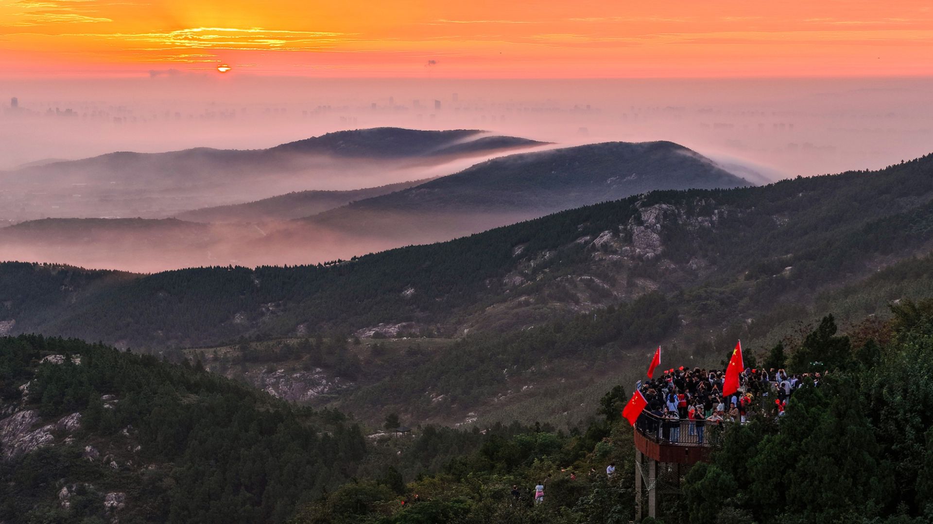 10月1日清晨,市民早早聚集涂山山頂,大家手揮國(guó)旗,共同迎接第一縷晨光。