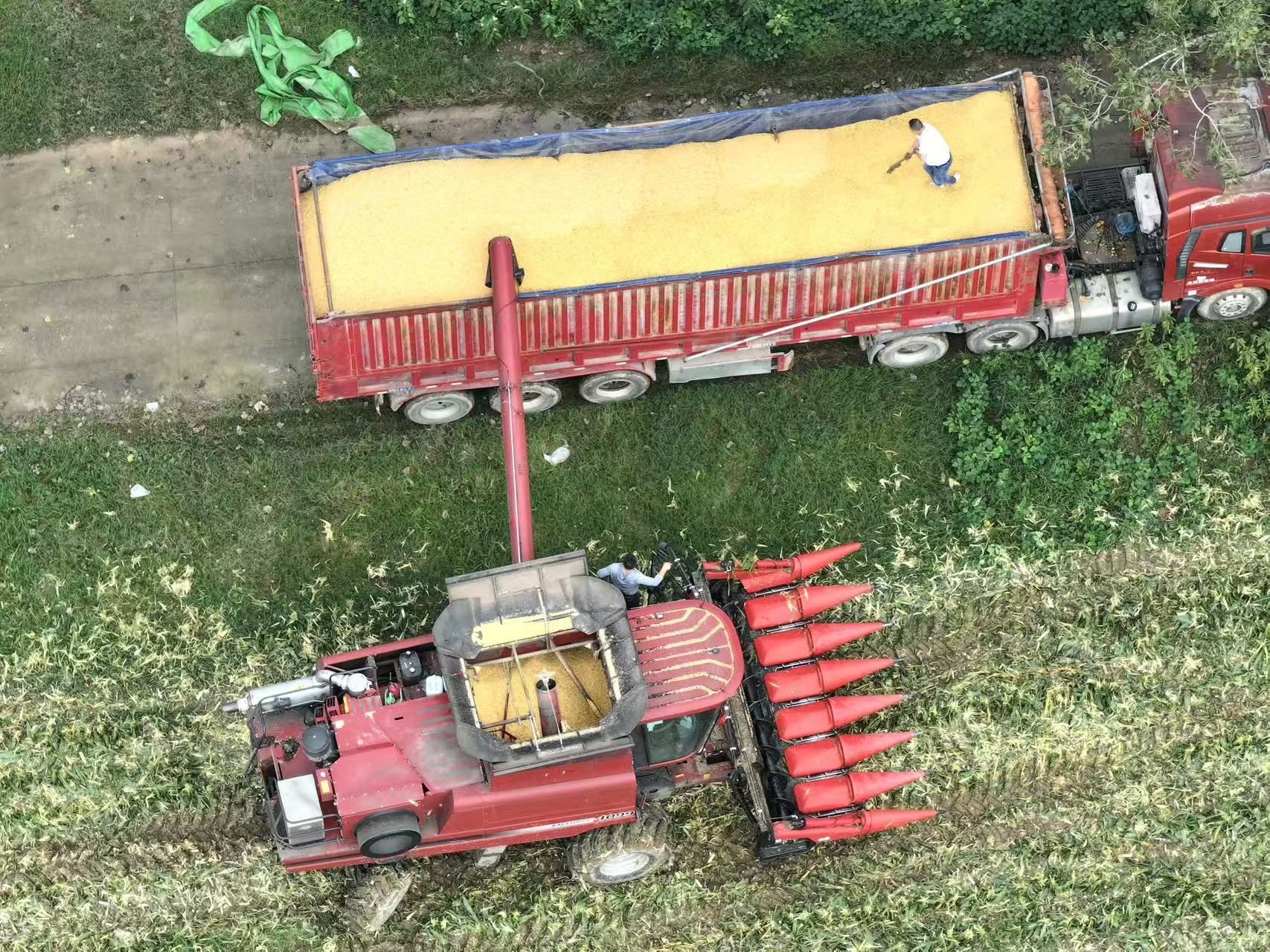 在收割機(jī)的后方,一輛輛運(yùn)輸車輛早已嚴(yán)陣以待。通過(guò)輸送管,金黃的玉米粒如金色的瀑布般傾瀉而下,很快便裝滿了一車又一車。運(yùn)輸車輛在田間小道上往來(lái)穿梭,將收獲的玉米運(yùn)往烘干點(diǎn),等待下一步走向市場(chǎng)的旅程。