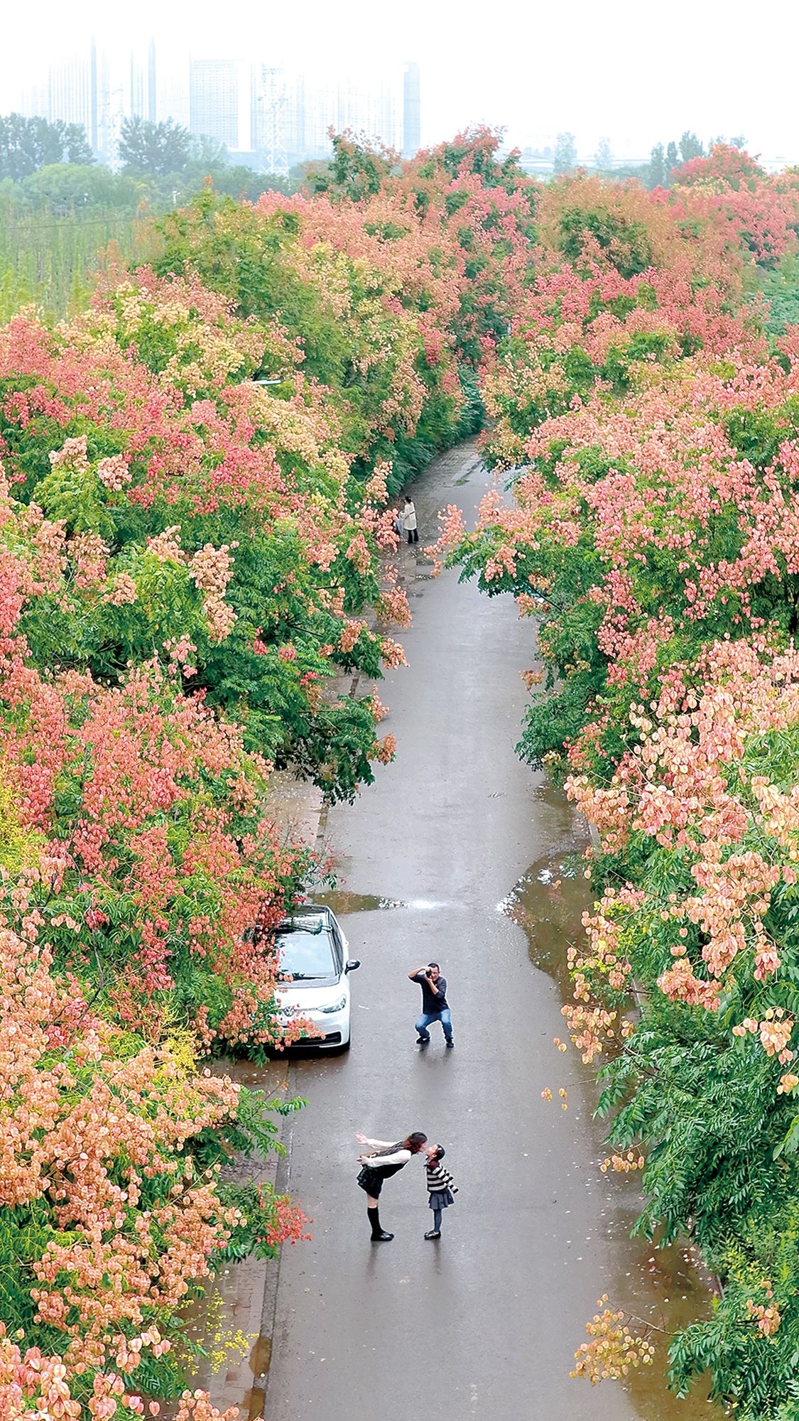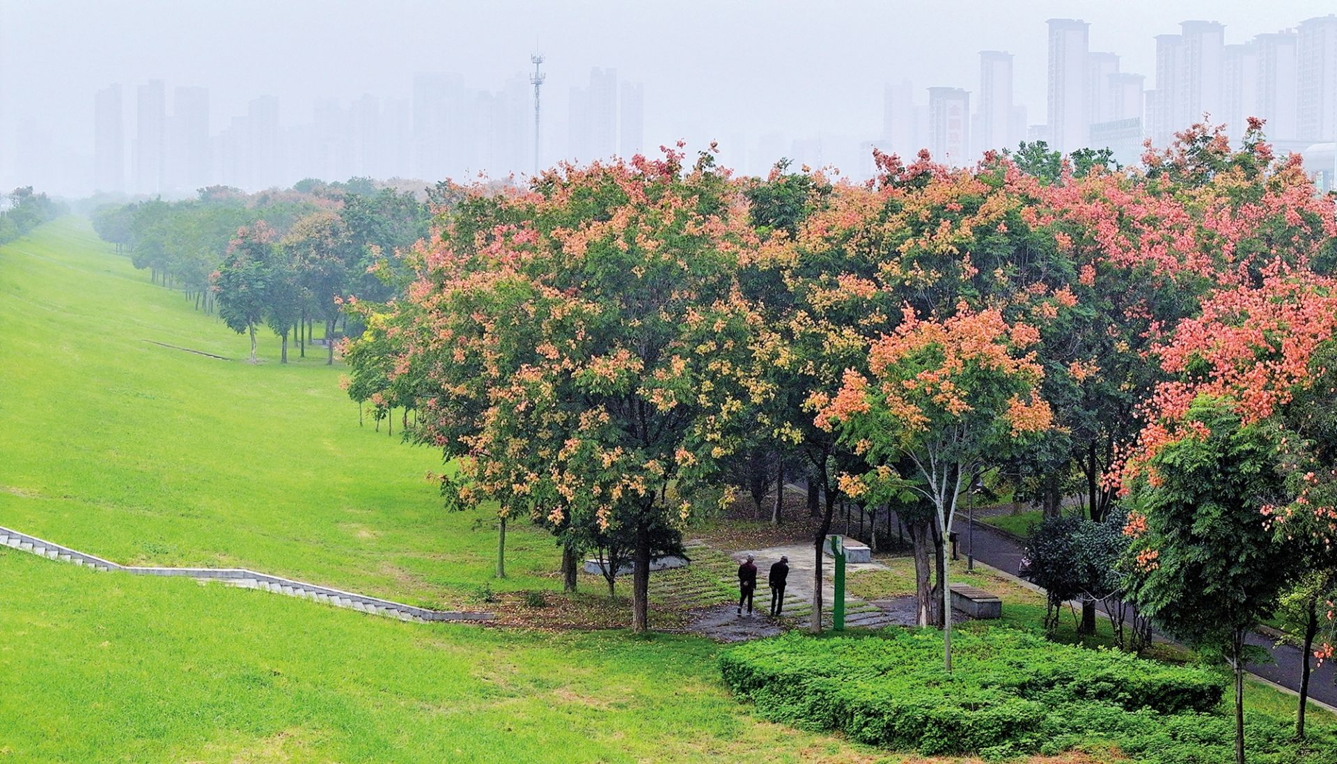 龍子湖東公園層林盡染,秋色宜人,市民在樹下拍照打卡。(劉晨 陳昂)