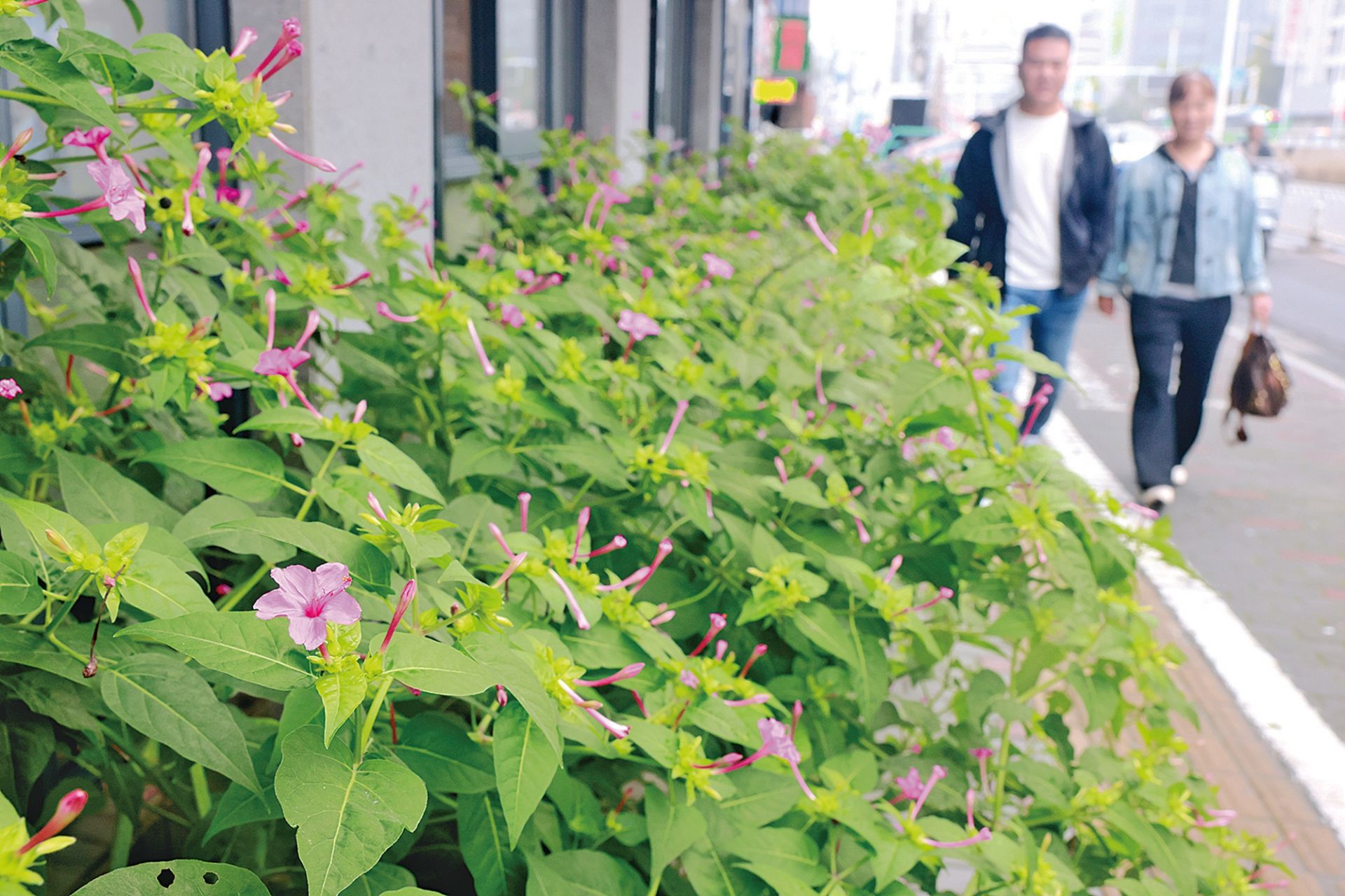 龍子湖東岸公園內粉黛亂子草盛開,吸引眾多游人合影留念。