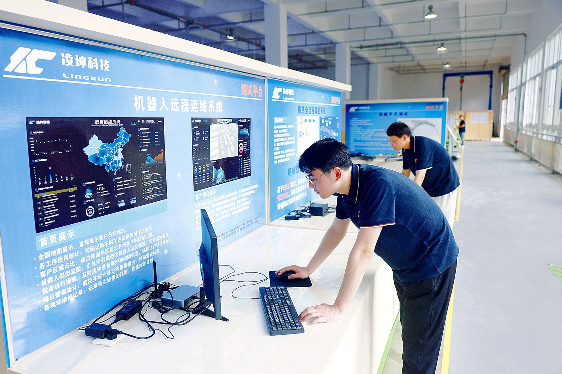 凌坤智能自動化清潔維護(hù)設(shè)備創(chuàng)新、研發(fā)、生產(chǎn)基地項目現(xiàn)場,技術(shù)人員通過網(wǎng)絡(luò)實施機器人遠(yuǎn)程運維。