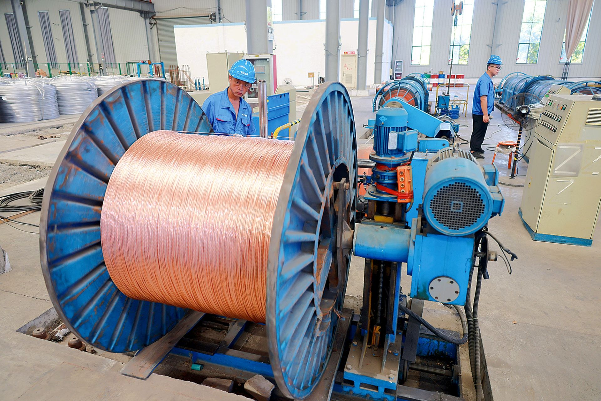 偉光電纜員工查看生產(chǎn)設(shè)備運轉(zhuǎn)情況。