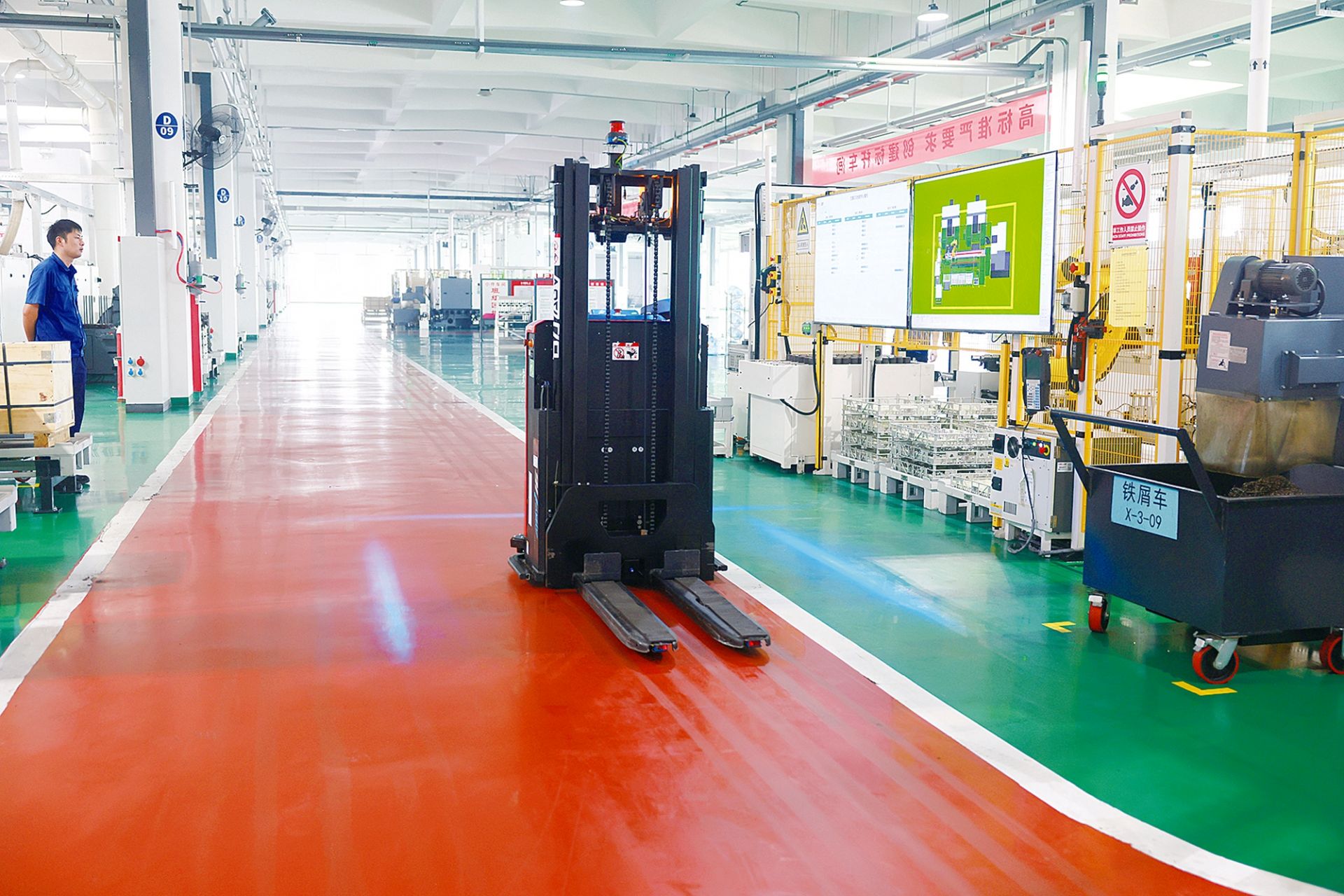 液力機械5G智能工廠數(shù)字化轉(zhuǎn)型示范項目現(xiàn)場,AGV智能物流小車按照生產(chǎn)程序工作。