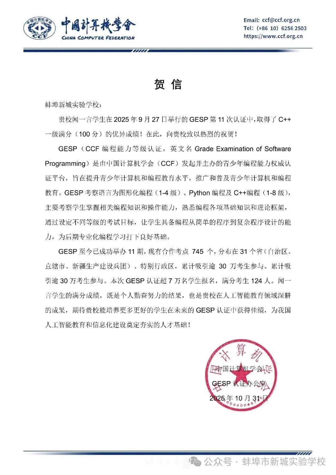 蚌埠發(fā)布客戶端訊(融媒體記者 周芳林 通訊員 段明磊)近日,中國計算機學會傳來捷報,蚌埠市新城實驗學校六年級學生聞一言在 2025年9月27 日舉行的GESP第11次認證中,憑借扎實的編程功底斬獲 C++ 一級滿分(100 分)的優(yōu)異成績。