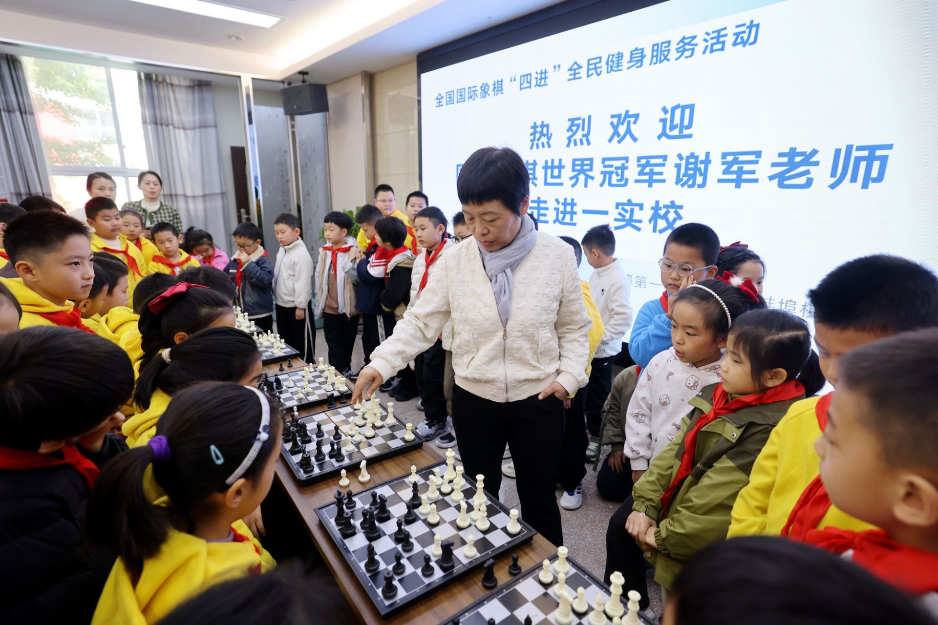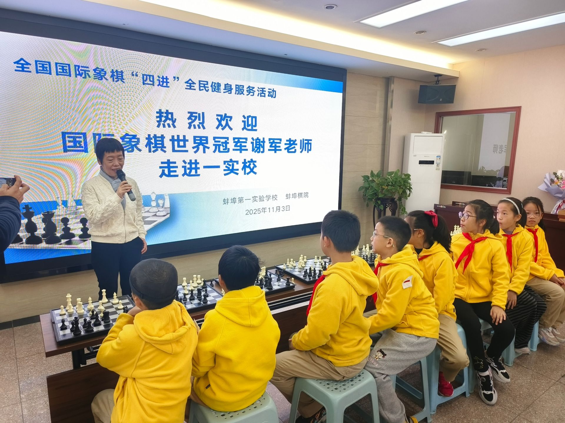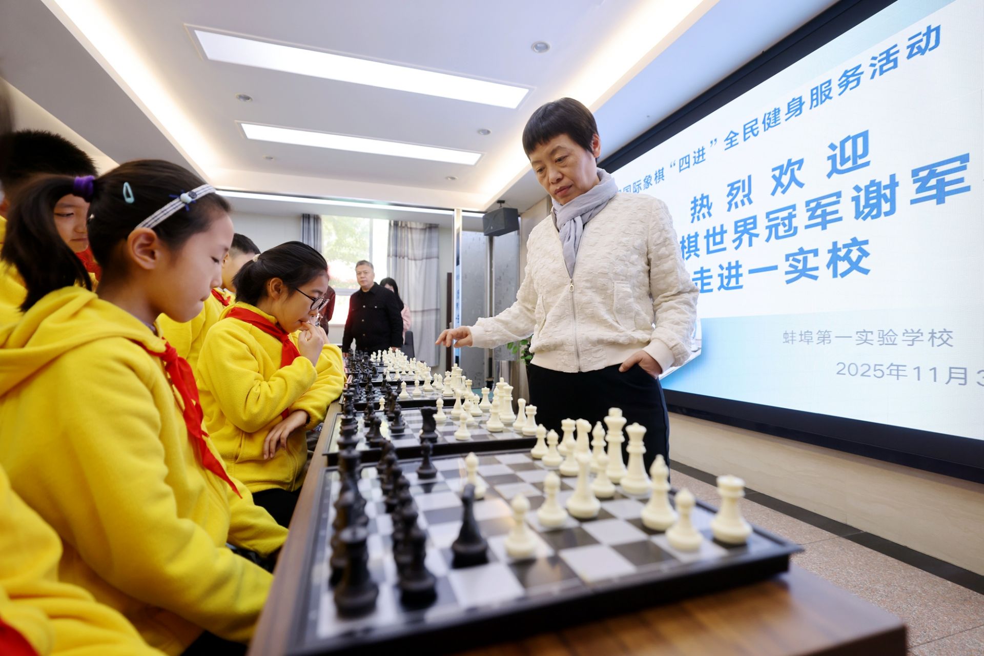 11月3日上午,全國國際象棋“四進(jìn)”全民健身志愿服務(wù)活動(dòng)在安徽省蚌埠第一實(shí)驗(yàn)學(xué)校舉行。四屆女子國際象棋世界冠軍、世界國際象棋聯(lián)合會(huì)副主席、中國國際象棋協(xié)會(huì)會(huì)長謝軍正與該校學(xué)生展開“車輪戰(zhàn)”對弈,1對多的實(shí)戰(zhàn)交流場景,成為全國國際象棋“四進(jìn)”(進(jìn)學(xué)校、進(jìn)社區(qū)、進(jìn)機(jī)關(guān)、進(jìn)養(yǎng)老機(jī)構(gòu))全民健身志愿服務(wù)活動(dòng)落地蚌埠的生動(dòng)注腳。全國國際象棋“四進(jìn)”(進(jìn)學(xué)校、進(jìn)社區(qū)、進(jìn)機(jī)關(guān)、進(jìn)養(yǎng)老機(jī)構(gòu))全民健身志愿服務(wù)活動(dòng)由國家體育總局棋牌管理中心主辦,安徽省象棋運(yùn)動(dòng)協(xié)會(huì)承辦,蚌埠棋院、蚌埠市國際象棋協(xié)會(huì)執(zhí)行。作為此次活動(dòng)的核心環(huán)節(jié),“車輪戰(zhàn)”吸引了校際賽中脫穎而出的8名小棋手參與。對局時(shí),謝軍時(shí)而俯身觀察學(xué)生布局,時(shí)而在棋盤旁停留思考,用溫和的語氣提醒小棋手“注意子力聯(lián)動(dòng)”;對局結(jié)束后,她又針對每盤棋的關(guān)鍵節(jié)點(diǎn)逐一復(fù)盤,從戰(zhàn)術(shù)選擇到邏輯判斷耐心拆解,將專業(yè)棋藝知識(shí)轉(zhuǎn)化為學(xué)生易懂的實(shí)戰(zhàn)技巧。據(jù)了解,蚌埠市近年來持續(xù)推進(jìn)國際象棋進(jìn)校園,目前已有50余所學(xué)校將其納入校本課程,蚌埠第一實(shí)驗(yàn)學(xué)校更是憑借系統(tǒng)的棋類教學(xué),培養(yǎng)出多名在省級、國家級青少年賽事中獲獎(jiǎng)的小棋手。此次活動(dòng)的開展,也標(biāo)志著全國國際象棋“四進(jìn)”全民健身志愿服務(wù)活動(dòng)在安徽省的又一次深度落地。安徽省棋院相關(guān)負(fù)責(zé)人表示,將總結(jié)蚌埠的經(jīng)驗(yàn)做法,后續(xù)在全省范圍內(nèi)推廣“冠軍+基層”的普及模式,讓國際象棋成為助力全民健身、促進(jìn)青少年全面發(fā)展的重要載體。