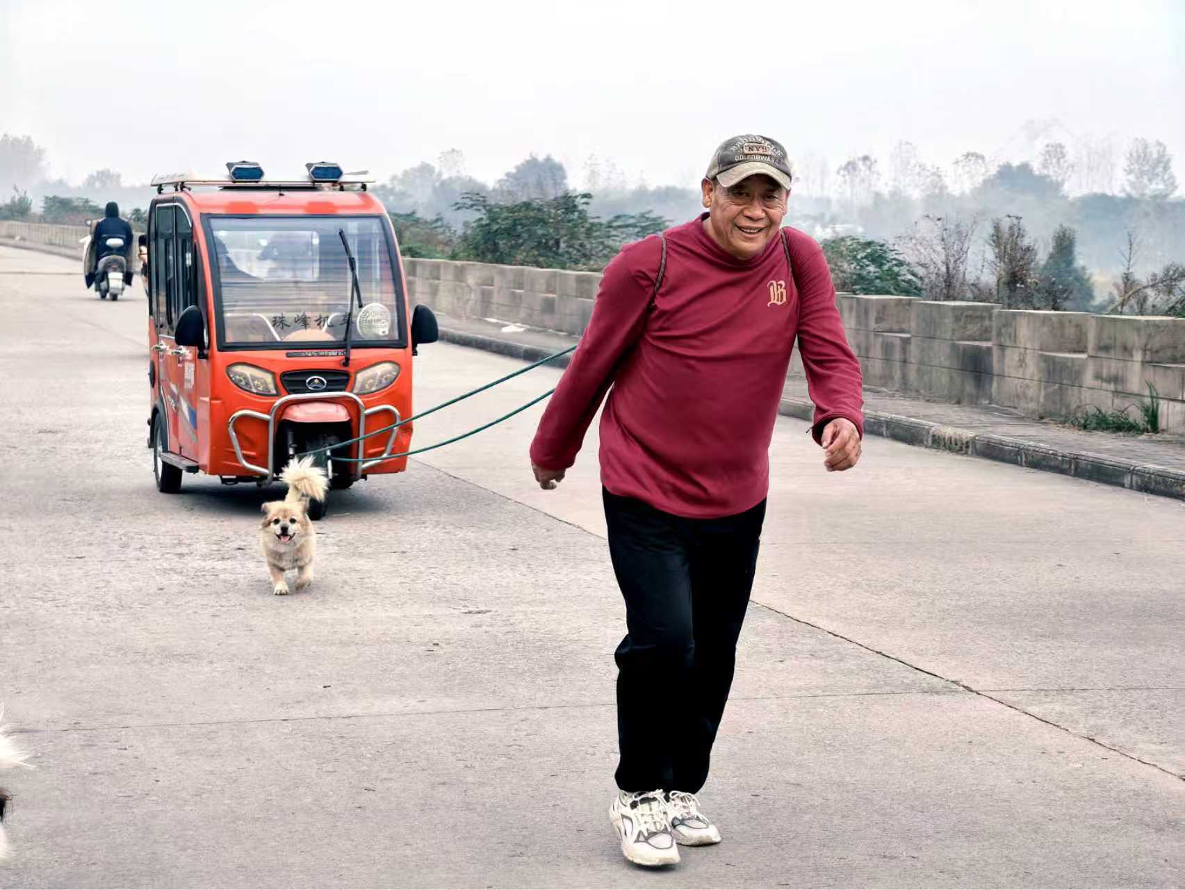 “老爺子虛歲100啦!1926年生,身子骨還算硬朗!”劉德才邊調(diào)整肩頭的繩結邊笑著說道。四年前,他發(fā)現(xiàn)父親年邁不愿在家喜歡坐三輪車出行,偶然間想到用繩子拉車,既能讓老父親出來放風、遛彎、散心,自己也能順便鍛煉,一舉兩得,便開啟了每日兩趟的“拉車晨練”。如今,他每天清晨六點至七點多、下午一點多到三四點準時出發(fā),沿淮河堤壩往返三公里,只為老人舒心、自己盡興。