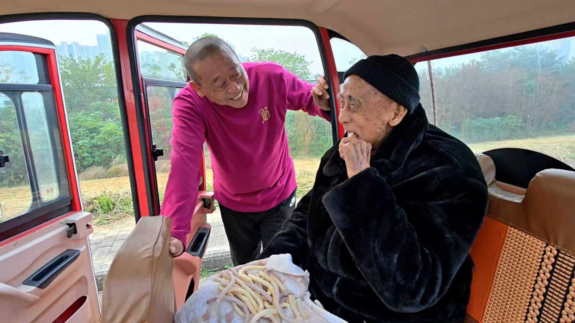 采訪中,百歲老人在車里閉目養(yǎng)神,陽光灑在他布滿皺紋的臉上,安詳愜意。劉德才調(diào)整繩結或停車時輕手輕腳,“母親94歲安詳離世,讓我和哥哥姐姐們更珍惜陪父親的日子?!眲⒌虏派硇斡怖剩f起父親眼角滿是溫情。拉車途中,他總跟父親念叨家常,即便老人偶爾糊涂,也會緩緩睜眼,朝著兒子露出慈祥的笑。河畔微風、淮水粼粼波光與父子間的輕聲絮語,構成了淮河岸邊最動人的圖景。