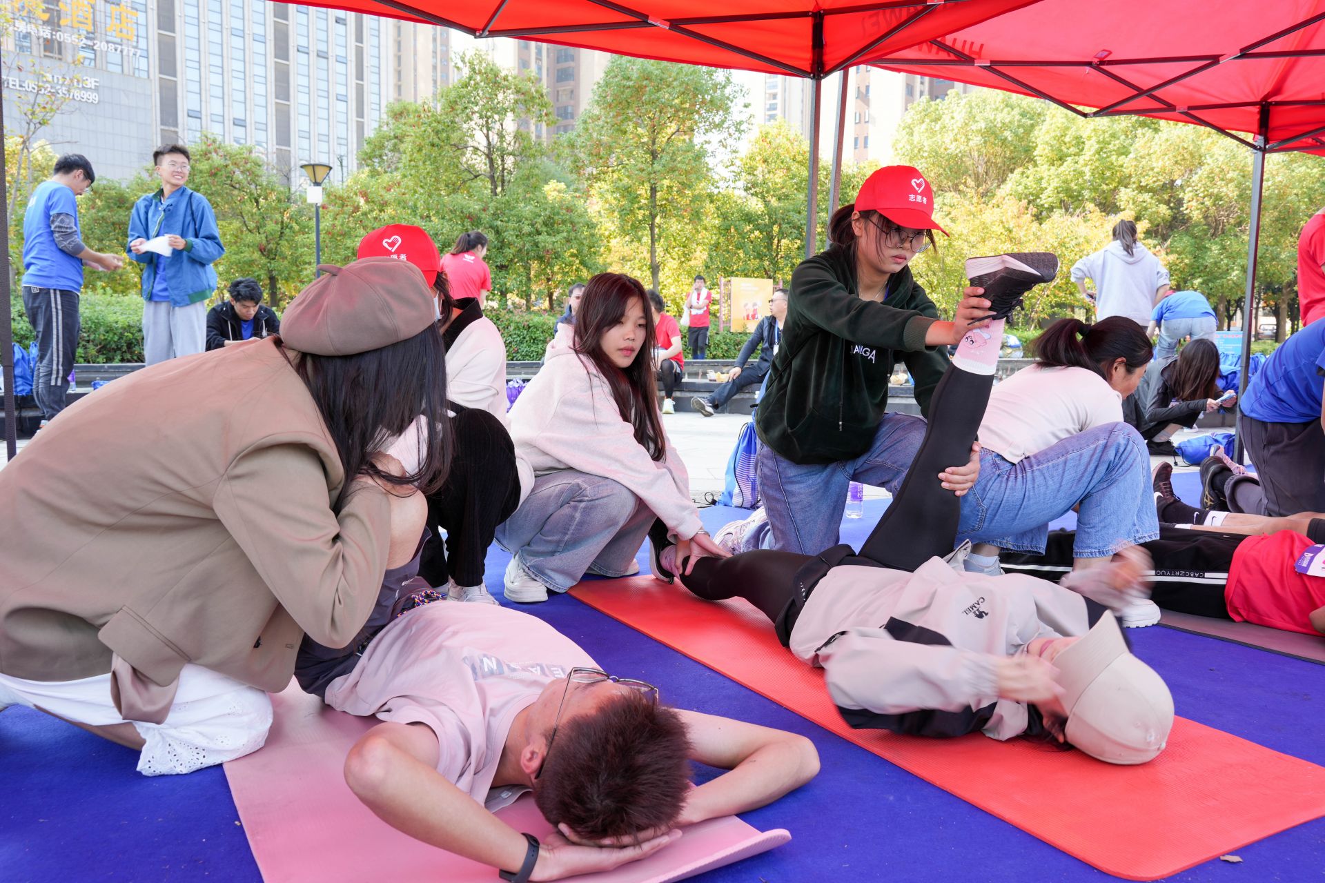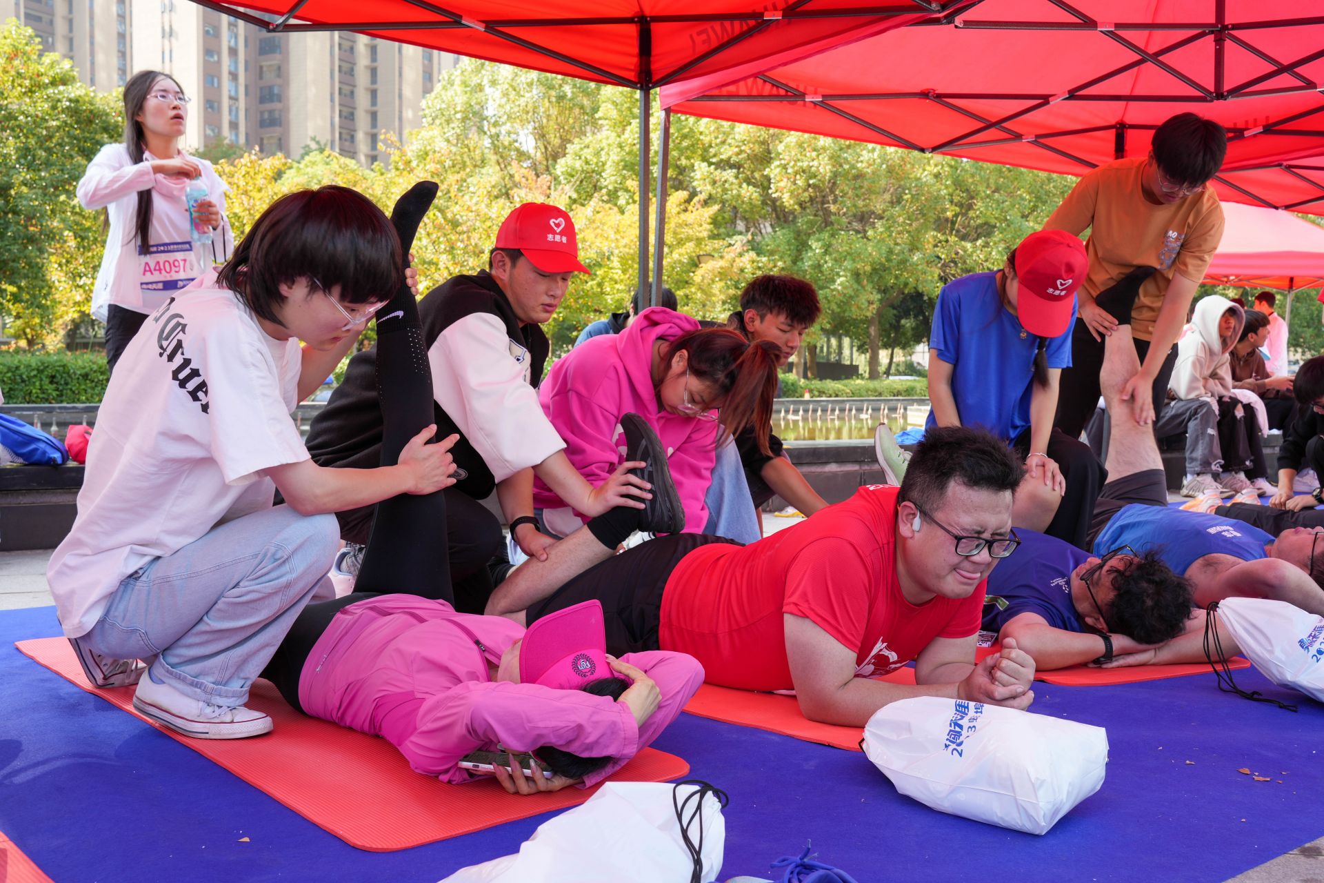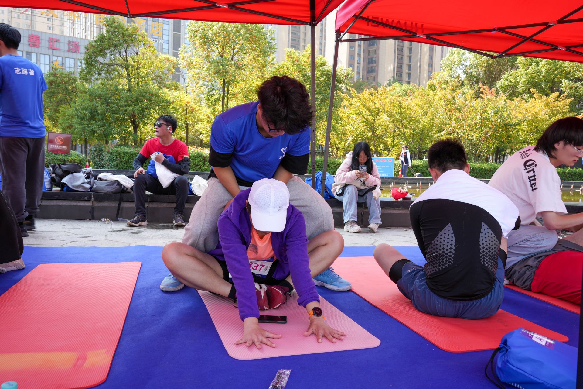 隨著選手們陸續(xù)沖過終點線,汪書勝藍和組員們也開始忙碌了起來?!澳睦锼??力度如何?……”志愿者們在幫助參賽選手拉伸時,不斷地輕聲進行詢問。在瑜伽墊上拉伸的參賽選手換了一批又一批,志愿者們堅持到終點處的選手陸續(xù)走完才開始休息。