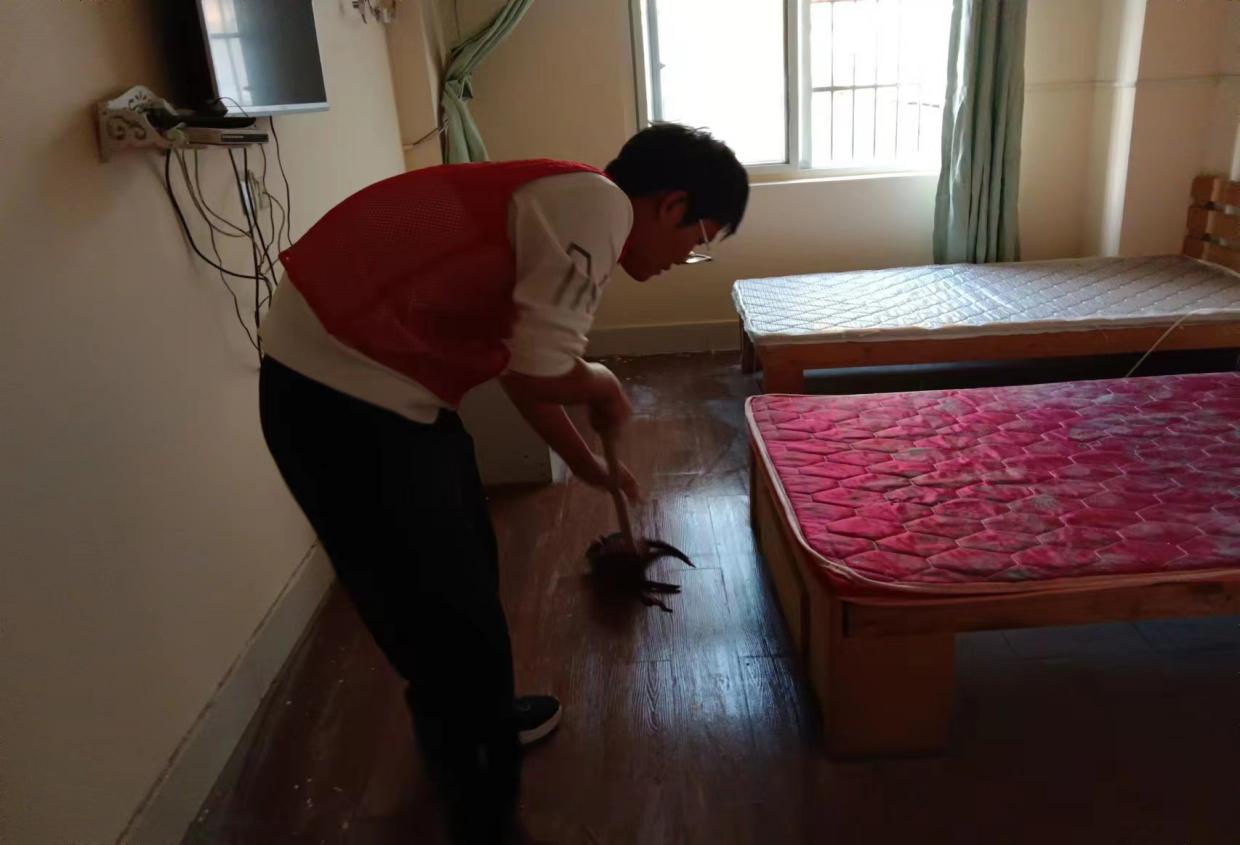 在社區(qū)志愿者的帶領下,大家手拿衛(wèi)生工具來到二樓各個房間和功能室,各自分工,干得熱火朝天。在師生和志愿者們的努力下,老人們的活動場地和居住環(huán)境變得更加干凈和整潔。打掃結束后,同學們還為敬老院的爺爺奶奶捶背、剪指甲,和他們聊天,老人們的臉上都洋溢著幸福的笑容。