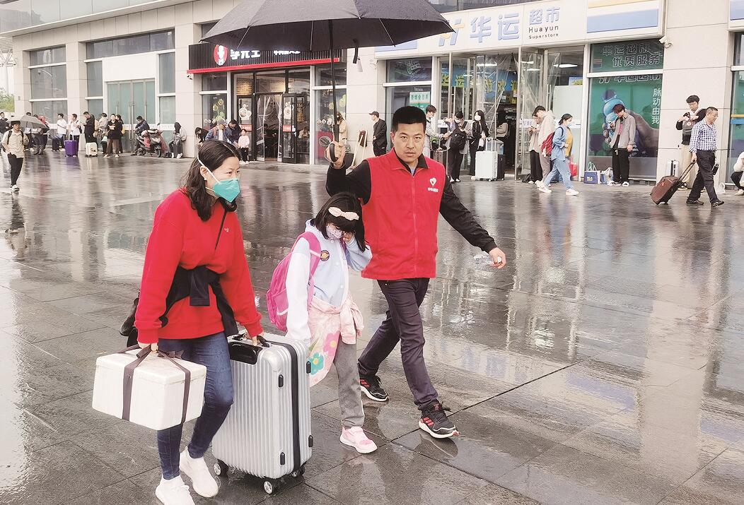 針對旅客返程高峰和較大雨情,蚌埠市善星公益協(xié)會組織100名志愿者開展“志愿傘道、禮送賓客”活動,在蚌埠南站落客平臺撐傘護送游客進站,用暖心的服務(wù)傳遞了蚌埠溫度、蚌埠情義。