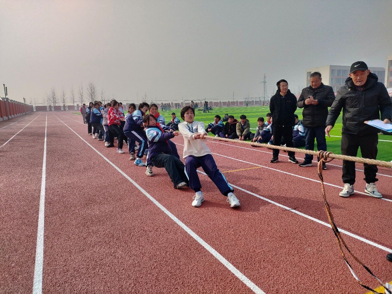 賽場上最激動人心的當屬拔河比賽,隊員們像是擰成了一股麻繩,只聽裁判一聲令下,個個使出了九牛二虎之力,腳使勁地蹬著地,身體往后仰,用力地拉繩子。整個操場歡呼聲、吶喊聲響徹云霄。