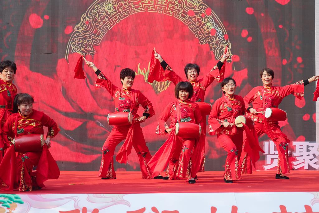 2023年12月28日,浙江省諸暨市趙家鎮(zhèn)村民在村晚舞臺上表演腰鼓。新華社記者 徐昱 攝