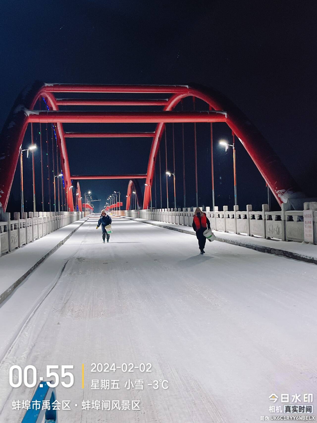 夜深時分,蚌埠閘橋面燈火通明,管理處安排人員連夜對交通橋鋪撒工業(yè)鹽防止橋面結冰,及時消除因降雪造成的不利影響;同時加派人手負責橋面巡邏,發(fā)現問題及時上報并處理,全力保障交通順暢。