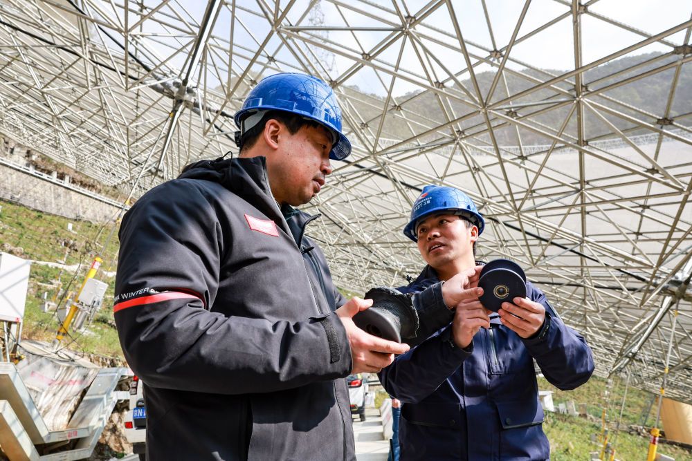 2023年2月13日,姜鵬(左)在貴州“中國天眼”的反射面板下與工作人員交談(維護(hù)保養(yǎng)期間拍攝)。新華社記者 歐東衢 攝