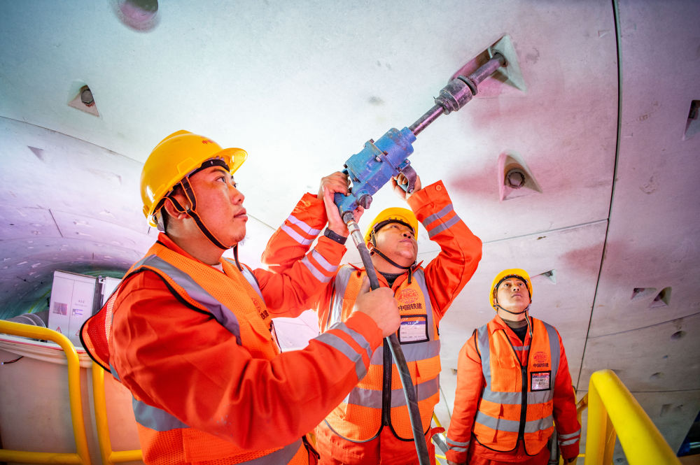 在中鐵十四局京唐城際鐵路運潮減河隧道內(nèi),施工人員在拼裝管片(2024年2月4日攝)。新華社發(fā)(中鐵十四局供圖)