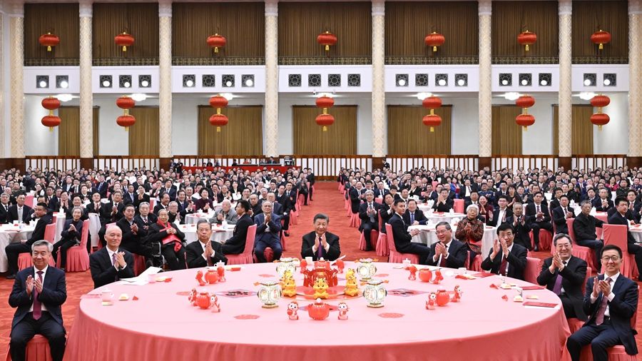 人民大會堂宴會廳燈光璀璨、喜氣洋洋,各界人士齊聚一堂、共迎新春,現(xiàn)場洋溢著歡樂祥和的節(jié)日氣氛。