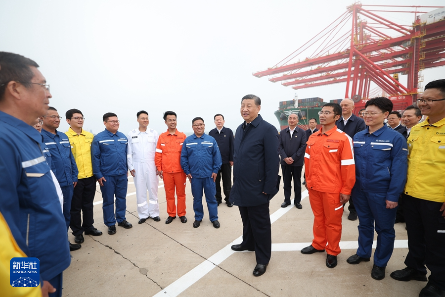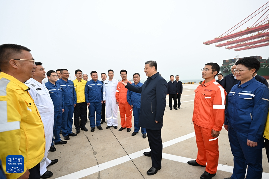 5月22日至24日,中共中央總書記、國(guó)家主席、中央軍委主席習(xí)近平在山東考察。這是22日下午,習(xí)近平在日照港親切慰問港口科技工作者、運(yùn)營(yíng)人員、航運(yùn)人員。 新華社記者 謝環(huán)馳 攝
