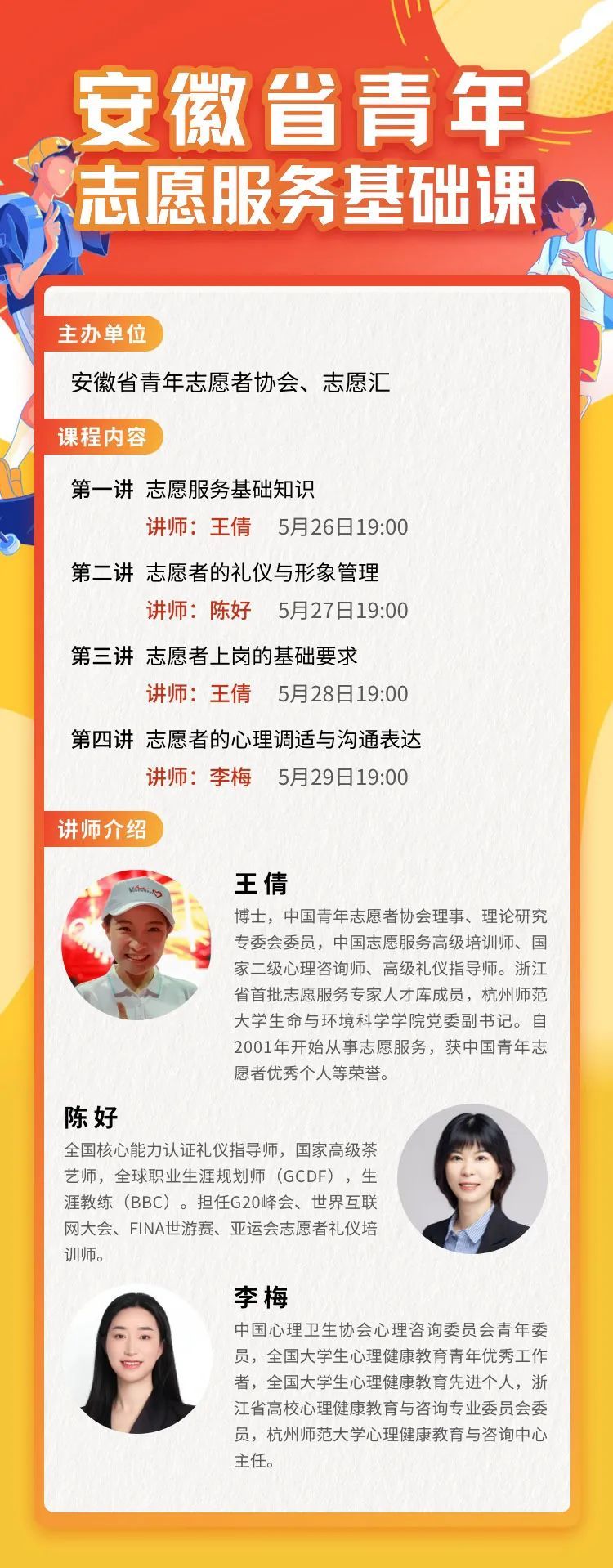根據(jù)中青發(fā)[2022]13號(hào)《共青團(tuán)做好新時(shí)代青年人才培養(yǎng)工作的行動(dòng)計(jì)劃》的要求,為積極推動(dòng)青年公益人才培育,倡導(dǎo)志愿服務(wù)精神,落實(shí)青年志愿者崗前培訓(xùn)要求,安徽省青年志愿者協(xié)會(huì)聯(lián)合“志愿匯”平臺(tái)共同推出“安徽省青年志愿服務(wù)基礎(chǔ)課”線上培訓(xùn)活動(dòng),為廣大青年志愿者提供志愿服務(wù)的基礎(chǔ)理念教育和服務(wù)能力指導(dǎo)。