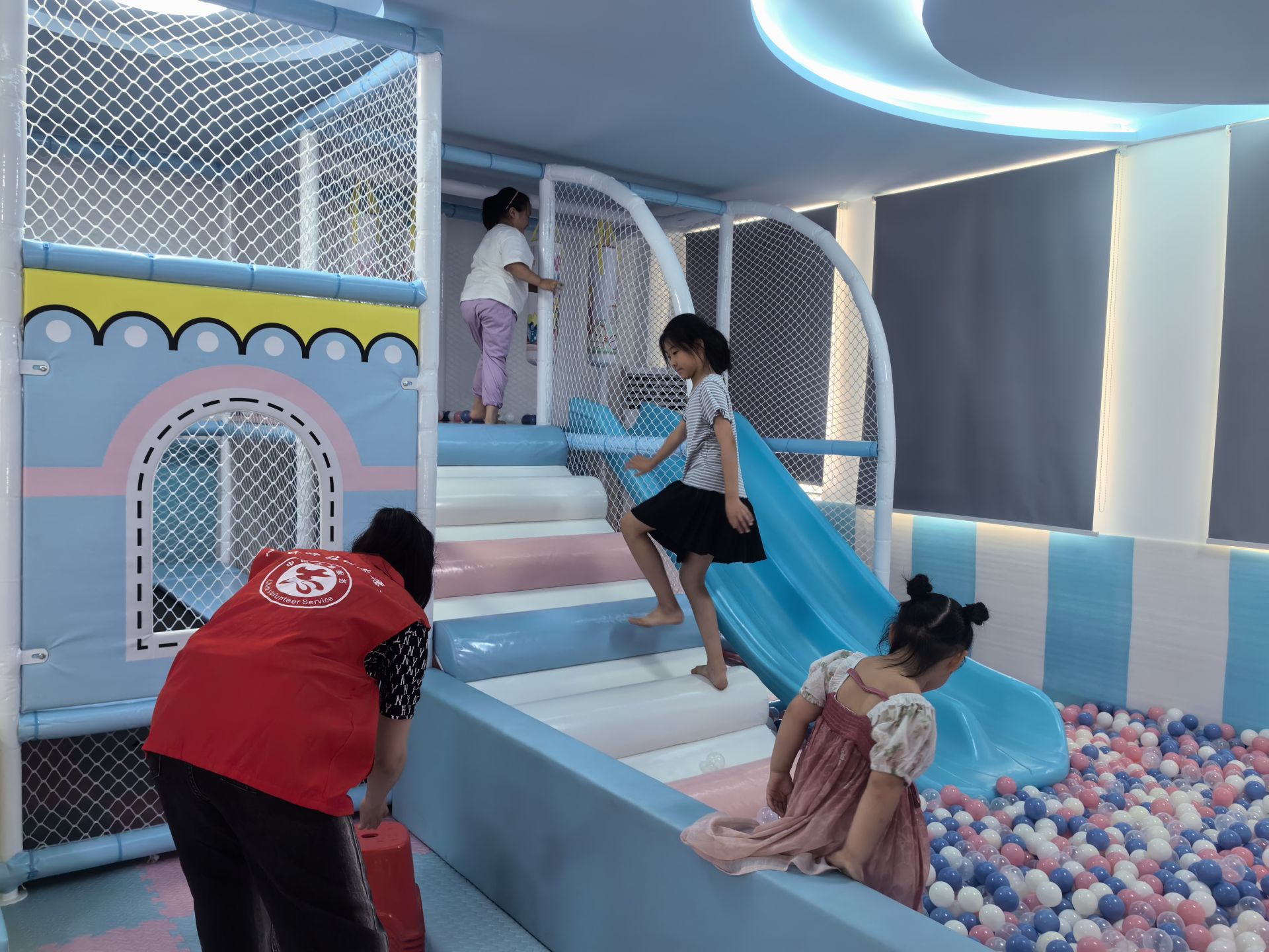 活動(dòng)現(xiàn)場(chǎng)志愿者對(duì)小朋友們說(shuō):眼睛看好滑梯階梯,爬到頂,坐穩(wěn)后,兩手扶著滑梯兩邊,雙腿并攏再滑下來(lái)。小朋友們排成一隊(duì),一個(gè)接一個(gè)地滑下來(lái),像小勇士一樣勇敢的挑戰(zhàn)自我,在志愿者的看護(hù)下,開(kāi)心玩樂(lè)的途中也保證了小朋友們的安全,歡笑聲此起彼伏,大家都玩得樂(lè)不思蜀。