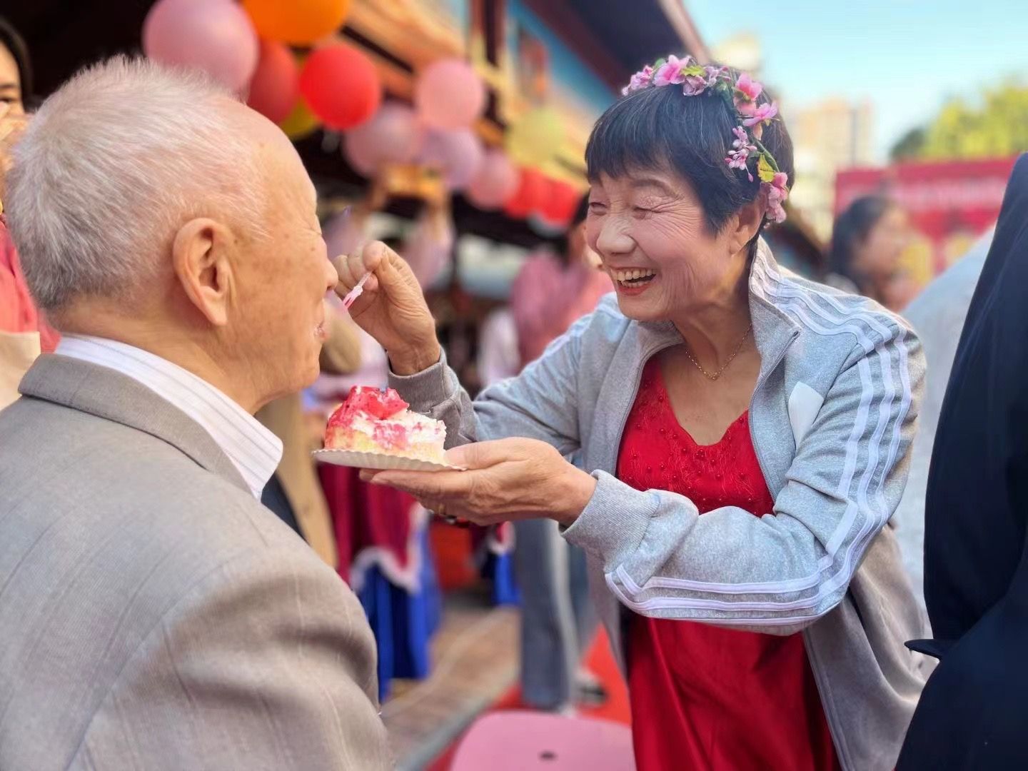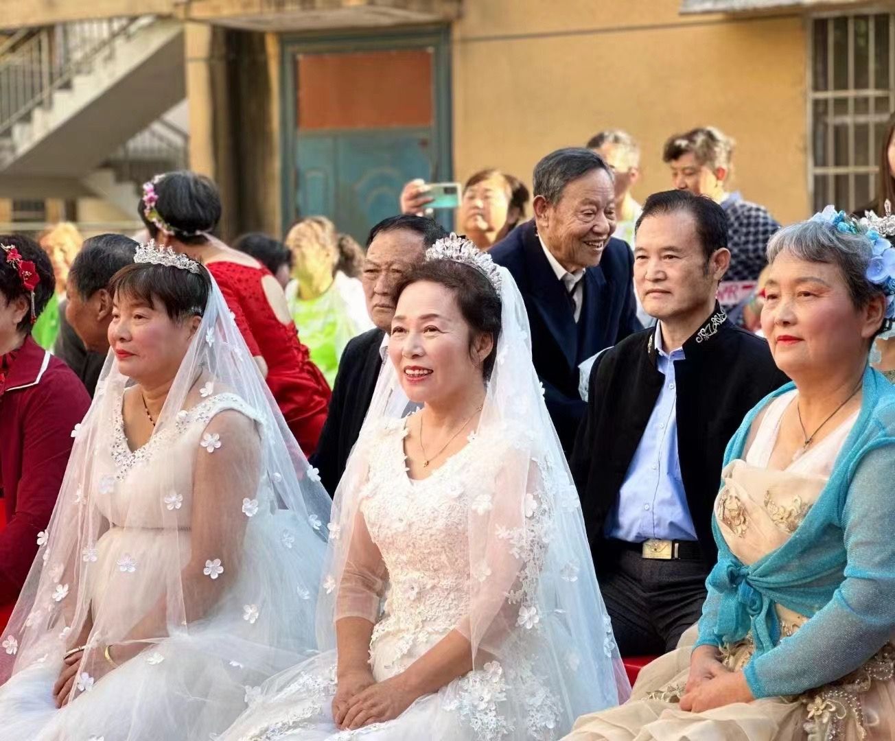 從青絲到白發(fā),從愛情到親情,陪伴是最長情的告白。在婚禮儀式上,10對銀發(fā)新人身著西式禮服或中式喜服,手牽著手走過紅毯,并肩而立?!靶吕伞鄙癫赊绒?,“新娘”笑容燦爛。記者了解到,這些老人中,婚齡最長的有50年,最短的也有40年。年輕時,由于受生活條件限制,大多數(shù)夫妻沒有舉辦過隆重的婚禮。